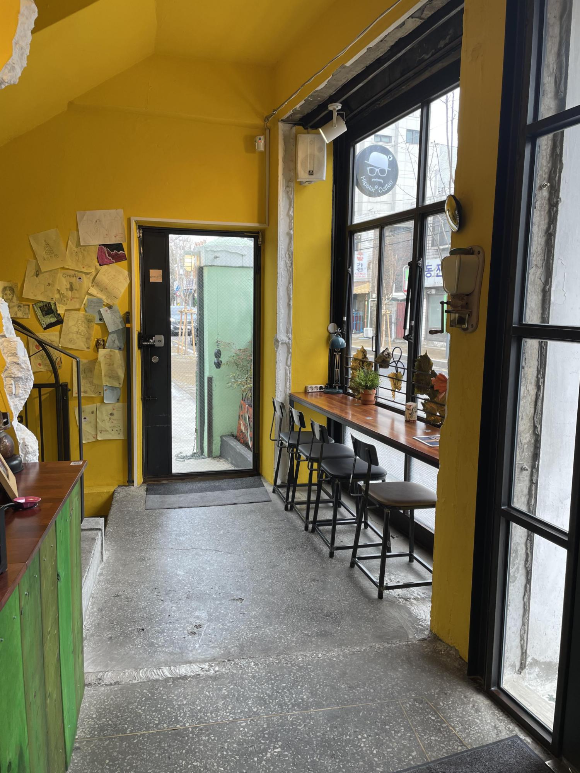카페 안에는 비비드한 노랑 벽 포인트에 노출 콘크리트의 인테리어가