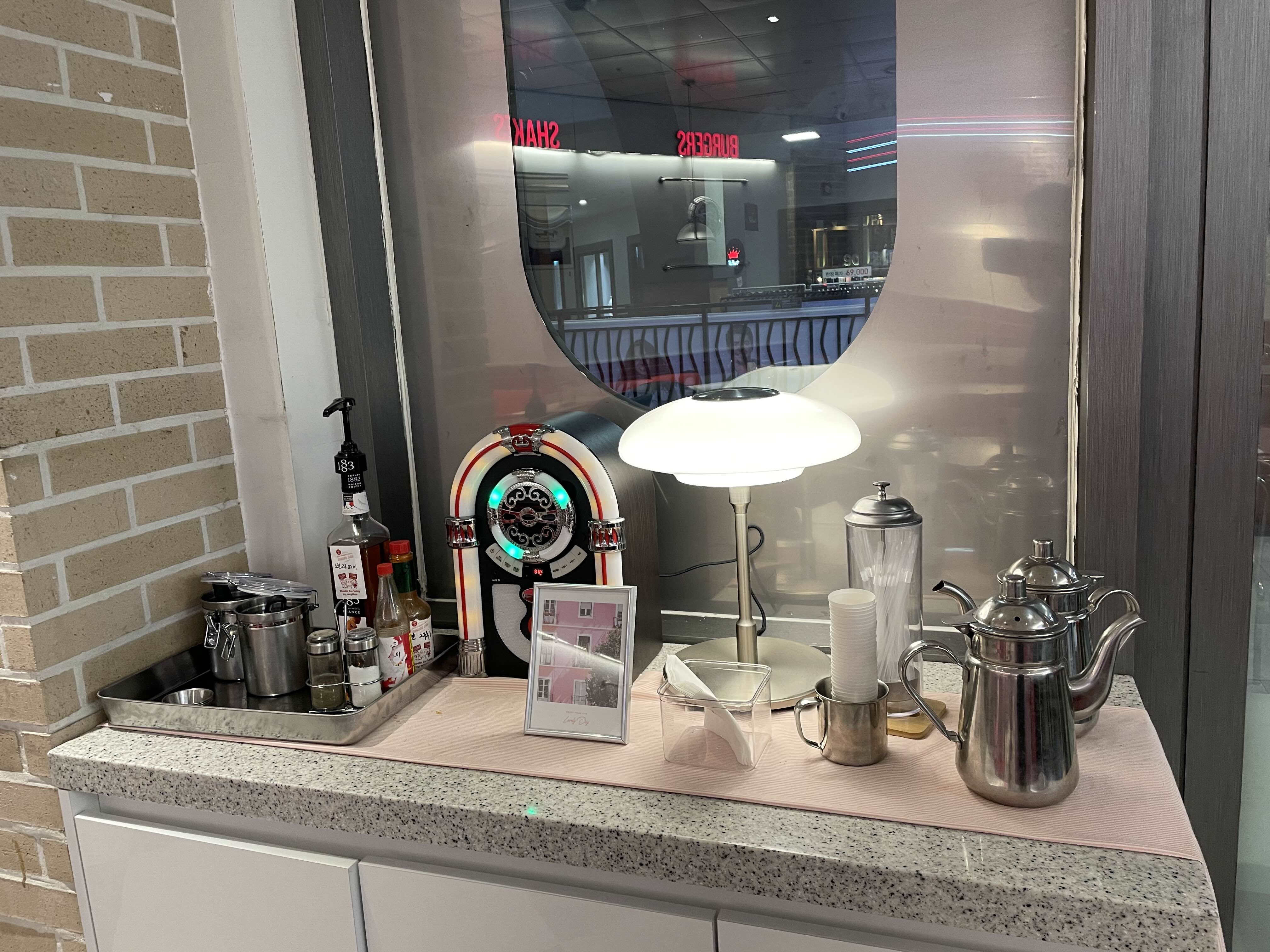 입구 문 쪽 바로 옆에는 소스들과 물, 시럽이 놓여져있었어요~