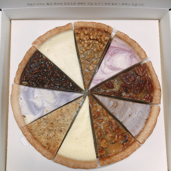 견과류가 들어간 파이들과 치즈케익파이들로 구성되어 있습니다.